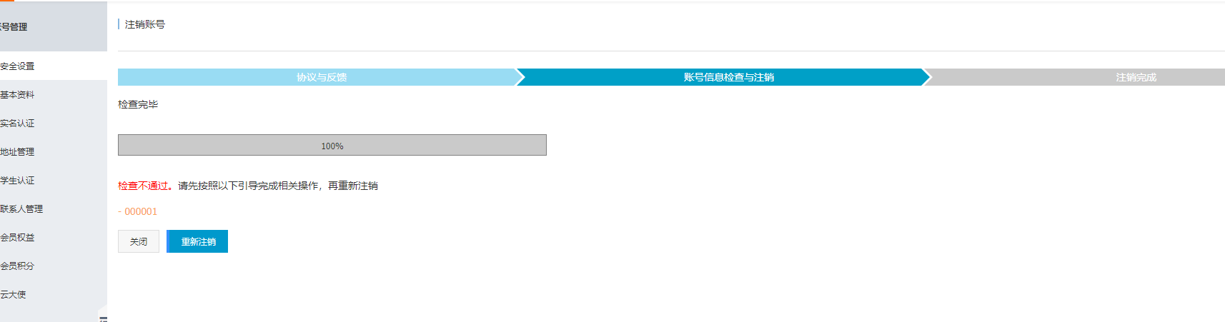 检查不通过。请先按照以下引导完成相关操作,再重新注销